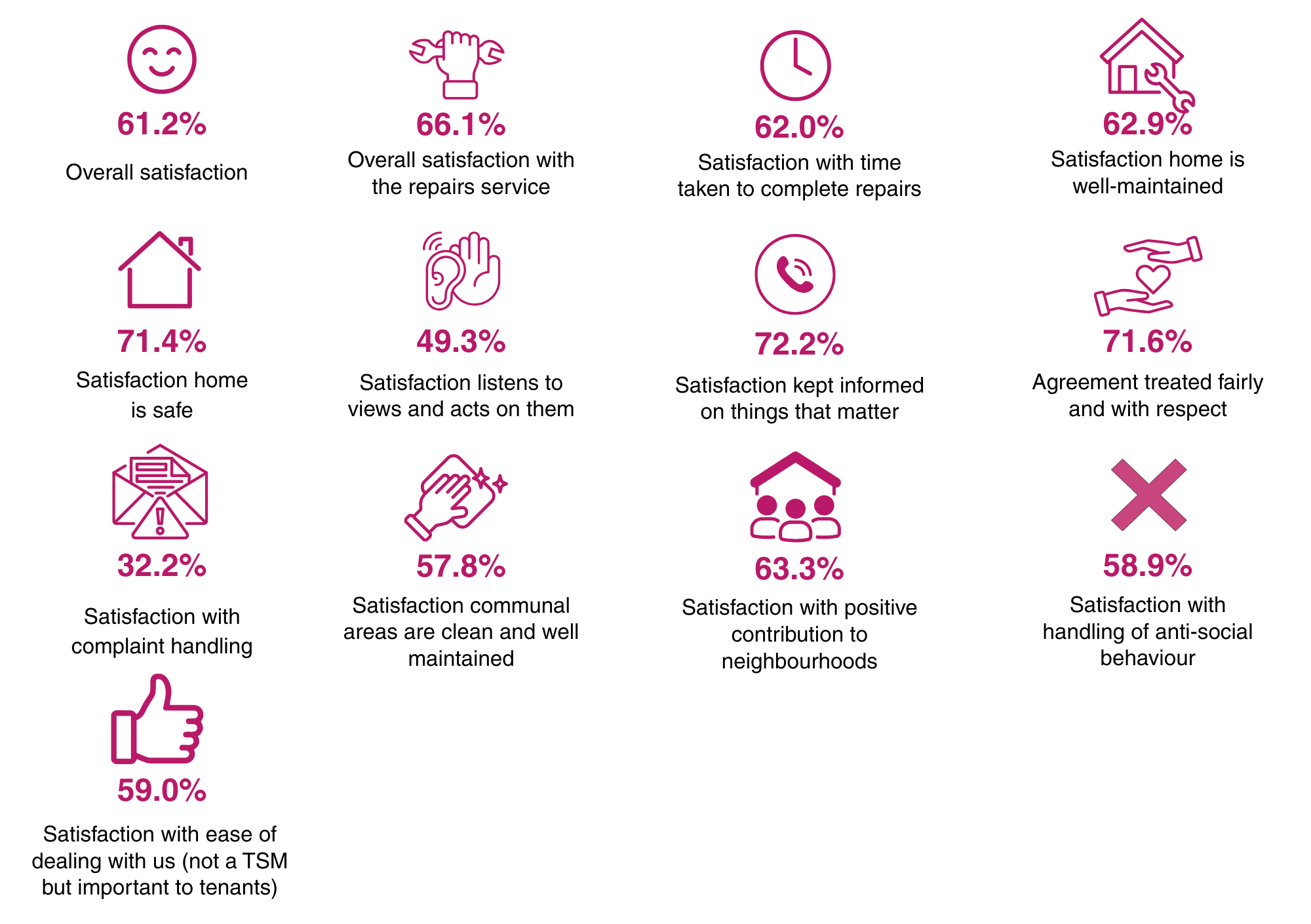 The Regulator of Social Housing’s Tenant Satisfaction Measures (TSMs) came into effect in April 2023. The TSMs are intended to help tenants to hold their landlords to account in areas that are important to them. There are 22 mandatory TSMs, 12 of which are based on perception surveys with a sample of tenants.